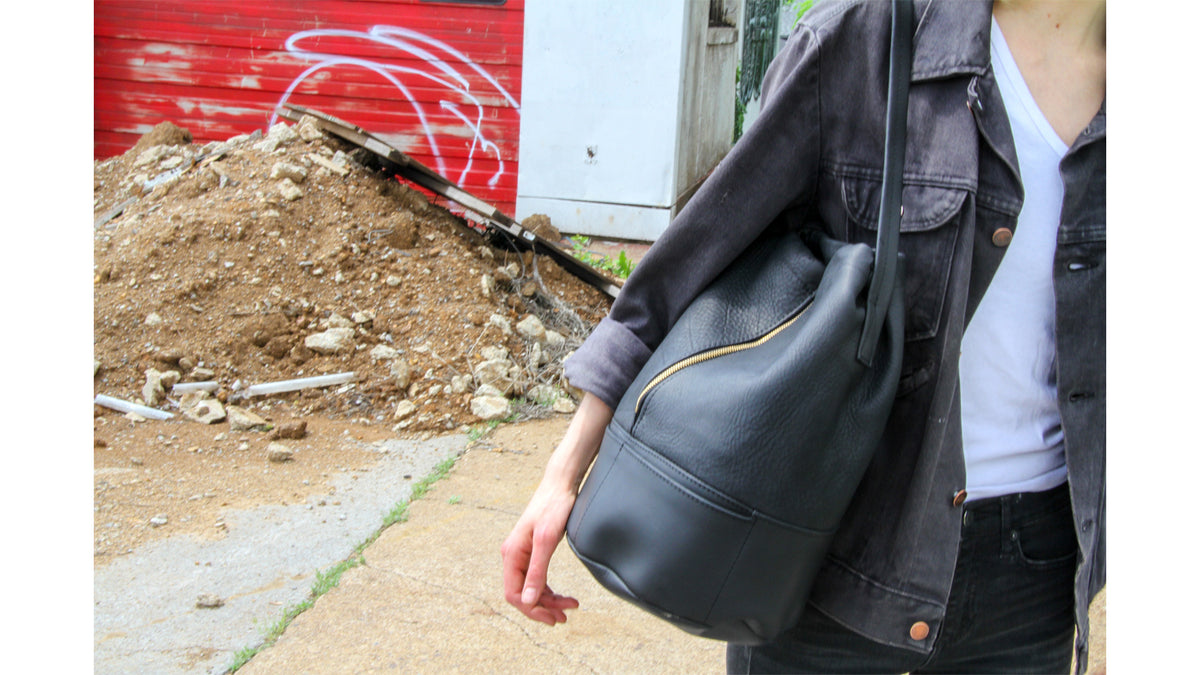 • Go from day to night in easy elegance with The Sedgwick Bucket Bag made of a mix of supple pebble grain and black napa silk leather. Modern and minimalist in design, it has an adjustable drawstring, two slit-front pockets, and a brass YKK front center zipper for easy access to items inside. Raw leather interior and an adjustable leather strap. This is the perfect grab-and-go bag in rich black or cognac brown.Read more